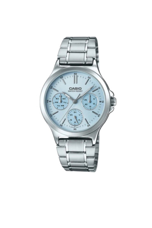 ساعت مچی زنانه کاسیو مدل LTP-V300D-2AUDF با صفحه ی آبی رنگ و سه نشانگر کارآمد(روز های هفته، تاریخ ماه،ساعت ۲۴ ساعته)با رنگ قاب و بند نقره ای در عین کلاسیک بودن حس خاص بودن را به شما هدیه می دهد.