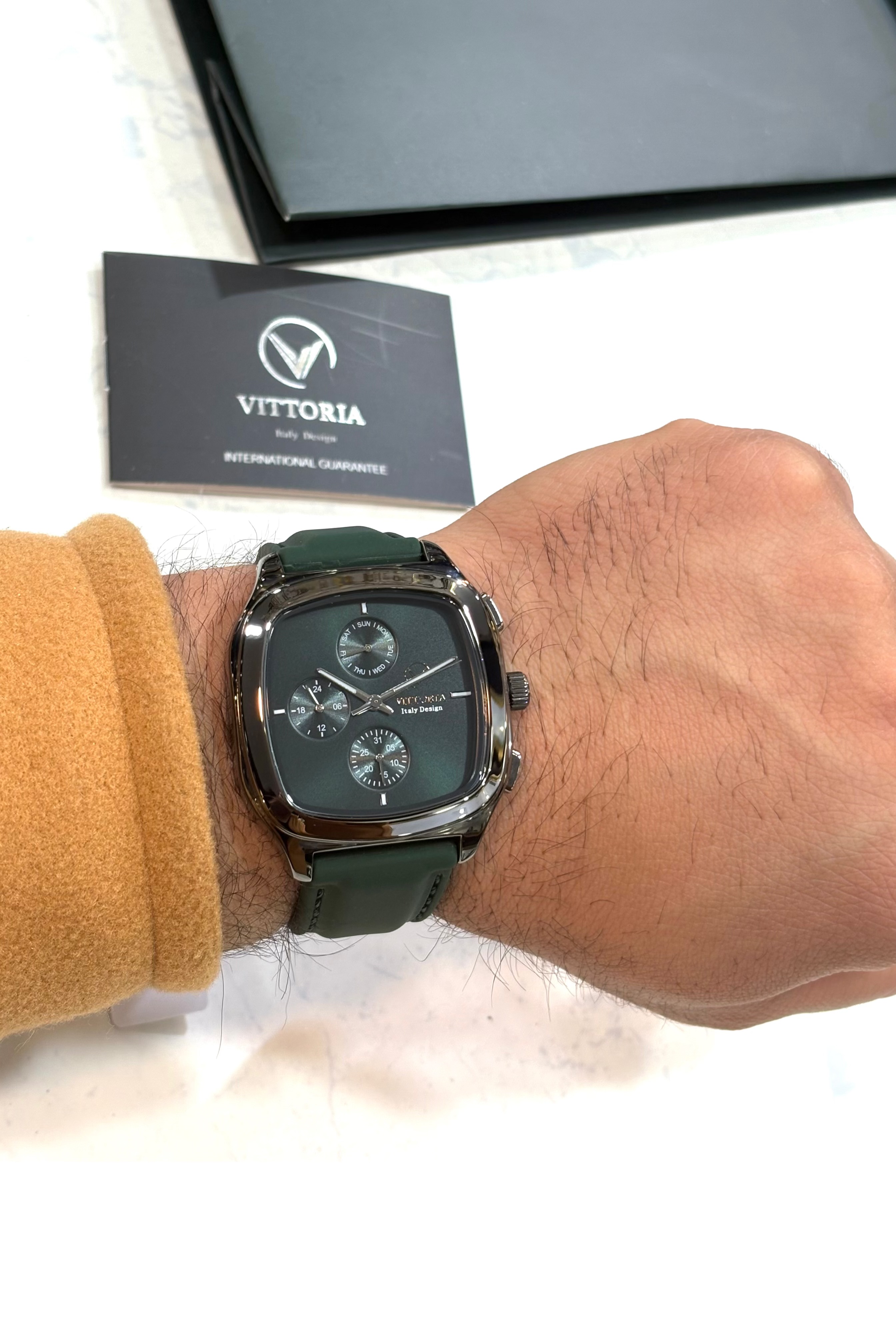 ساعت مچی اسپورت مردانه از برند ویتوریا با رنگ سبز بسیار شیک و خاص،فول دیت بودن این ساعت اون رو به شدت کاربردی تر میکنه.